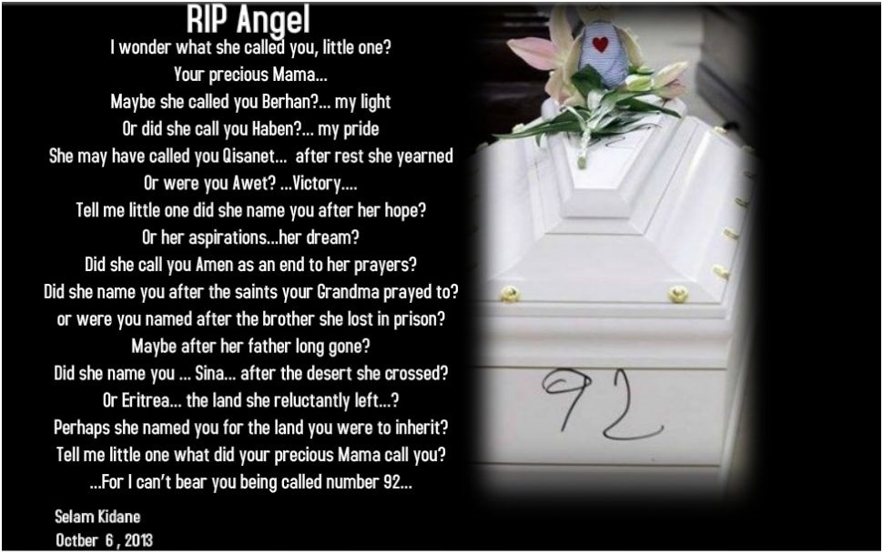 • Lettura poesia: RIP Angel, di Selam Kidane, 6 October 2013, in ricordo dei tantissimi migranti morti nel mare di Lampedusa da una Pubblicazione sul traffico di vite umane nel Sinai, del dicembre 2013