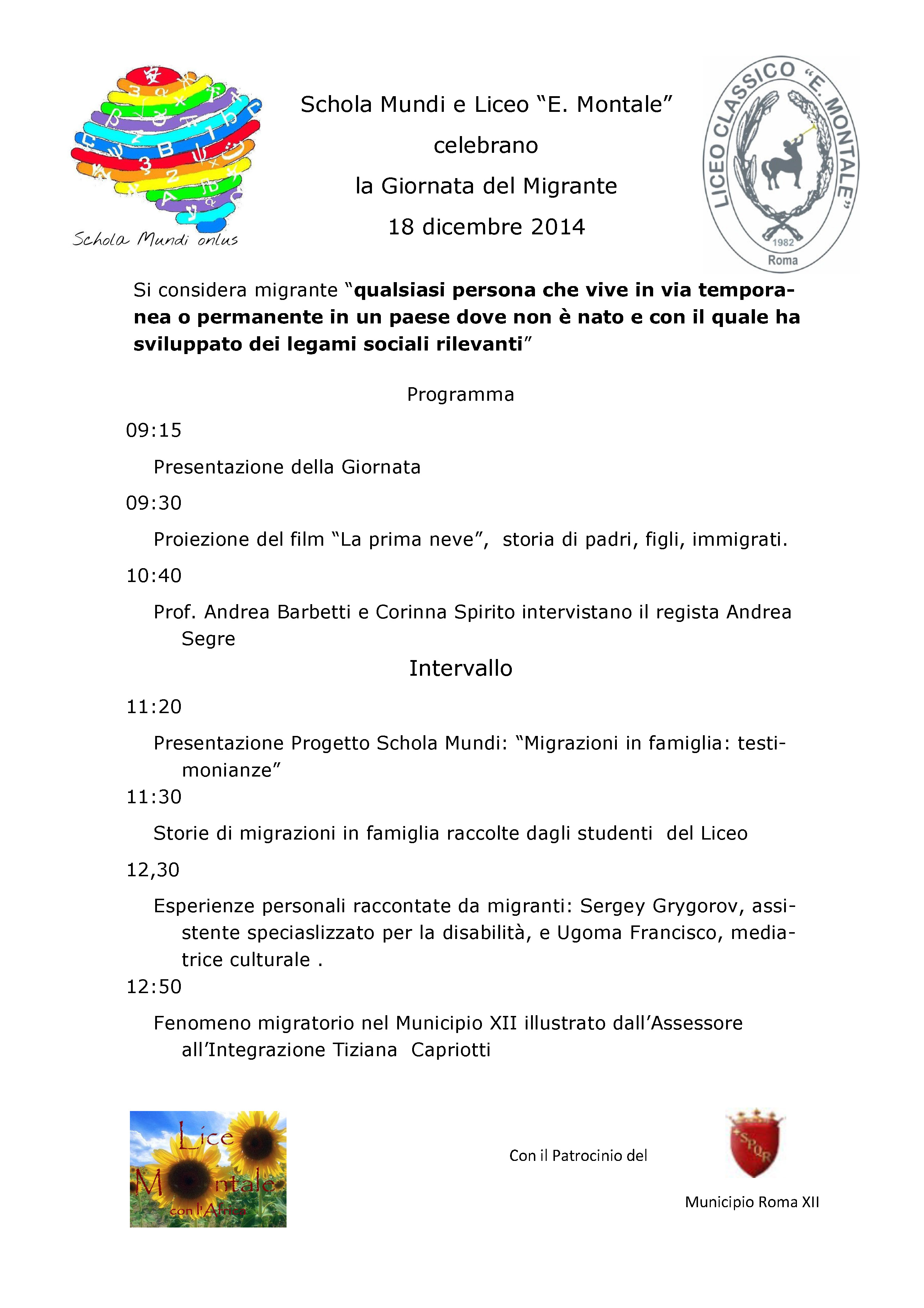 In preparazione di questa ricorrenza, Schola Mundi-Montale con l’Africa propone agli studenti del Liceo di raccogliere testimonianze di migrazioni all’interno delle proprie famiglie, tra i genitori, i nonni e, quando ci sono, anche tra i bisnonni, e di elaborarne il racconto con l’insegnante di riferimento della classe.