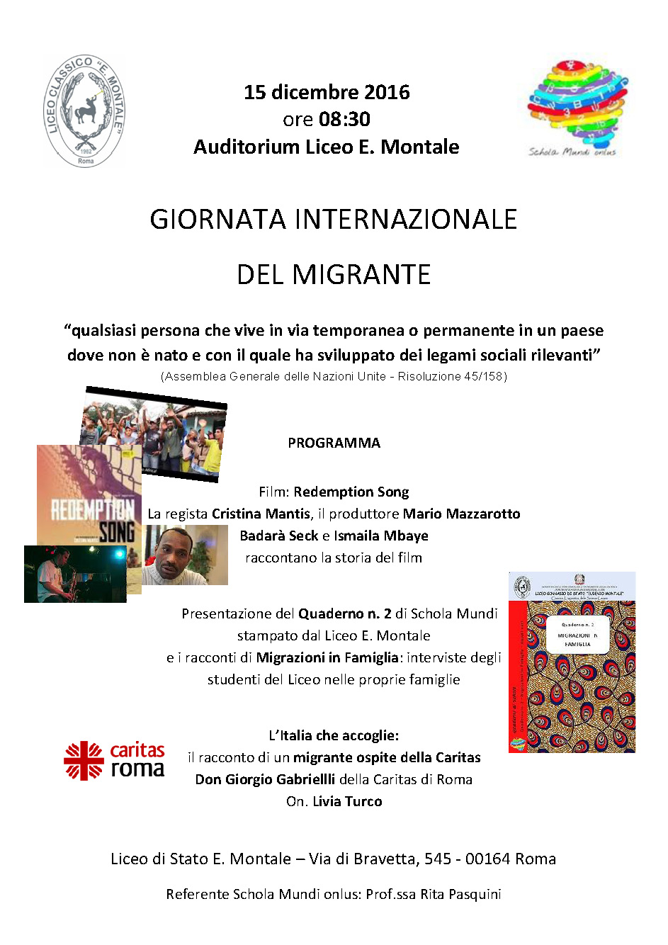 Giovedì  15 dicembre 2016, dalle ore 08:30, nell’Auditorium del Liceo, ci sarà la celebrazione della Giornata del Migrante. E’ il terzo anno che Schola Mundi onlus celebra con i ragazzi del Liceo Montale questa ricorrenza, a conclusione di un progetto educativo che ha raccolto l’entusiastico favore della Dirigente Scolastica, Prof.ssa Raffaella Massacesi. Con l’occasione sarà presentato il Quaderno n.2 di Schola Mundi, stampato dal Liceo, con i racconti raccolti dagli alunni nello scorso anno scolastico.