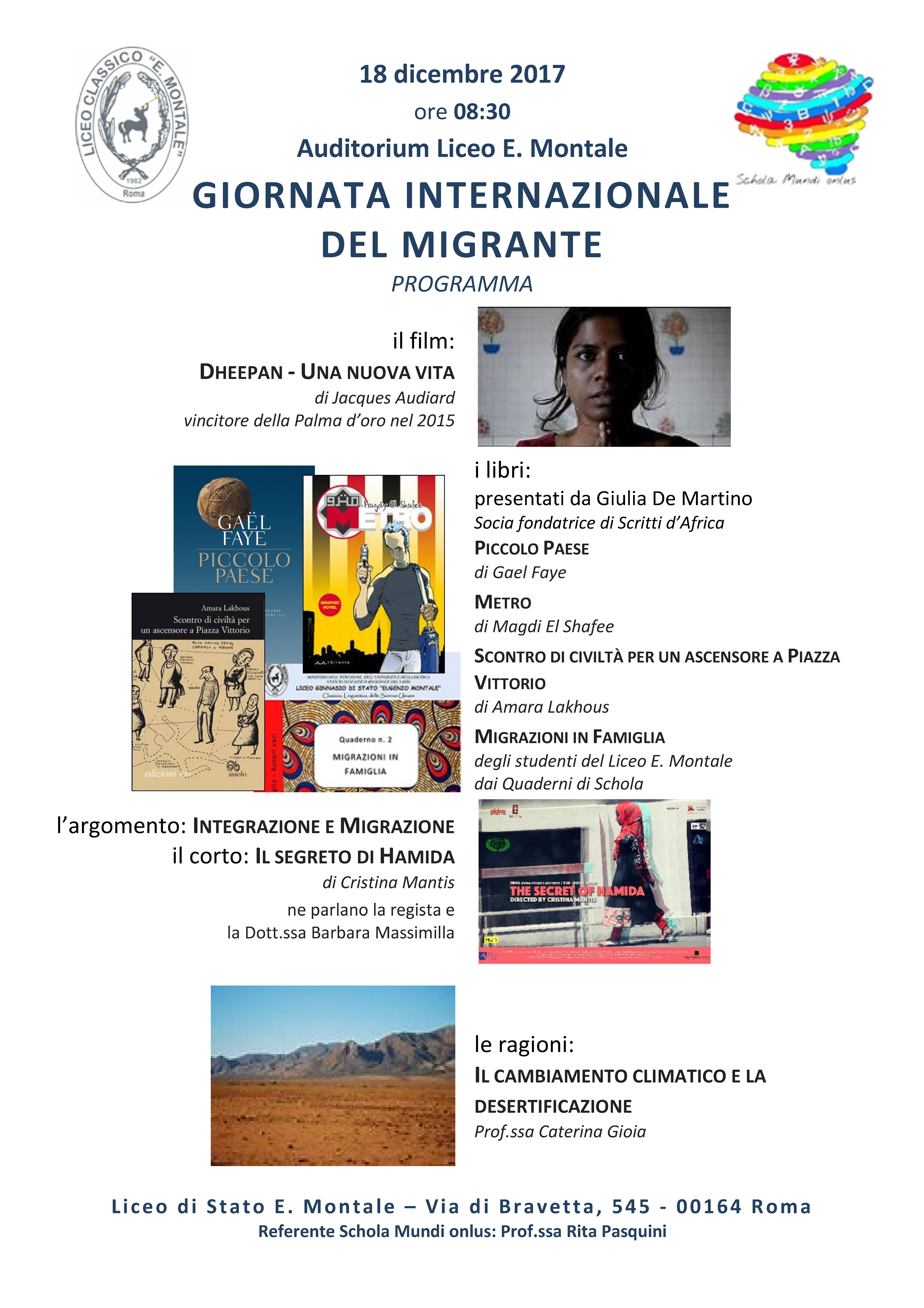 Lunedì 18 dicembre 2017, dalle ore 08:30 alle ore 13,00, nell’Auditorium del Liceo, ci sarà la celebrazione della Giornata del Migrante. Il programma comprenderà la visione del film ‘Dheepan - Una nuova vita’ del regista Jacques Audiard, vincitore della Palma d’oro nel 2015; il saluto di Schola Mundi onlus per il 10° compleanno dell’associazione; la visione del corto ‘Il segreto di Hamida’ della regista Cristina Mantis che insieme con la Dott. Barbara Massimilla ci racconteranno dell’esperienza fatta con il progetto che ha prodotto il filmato; la lettura di alcuni dei racconti di ‘Migrazioni in Famiglia’ elaborati dagli alunni e l’intervento della Prof.ssa Caterina Gioia su i cambiamenti climatici come una delle ragioni per la migrazione epocale a cui stiamo assistendo in questi ultimi anni.