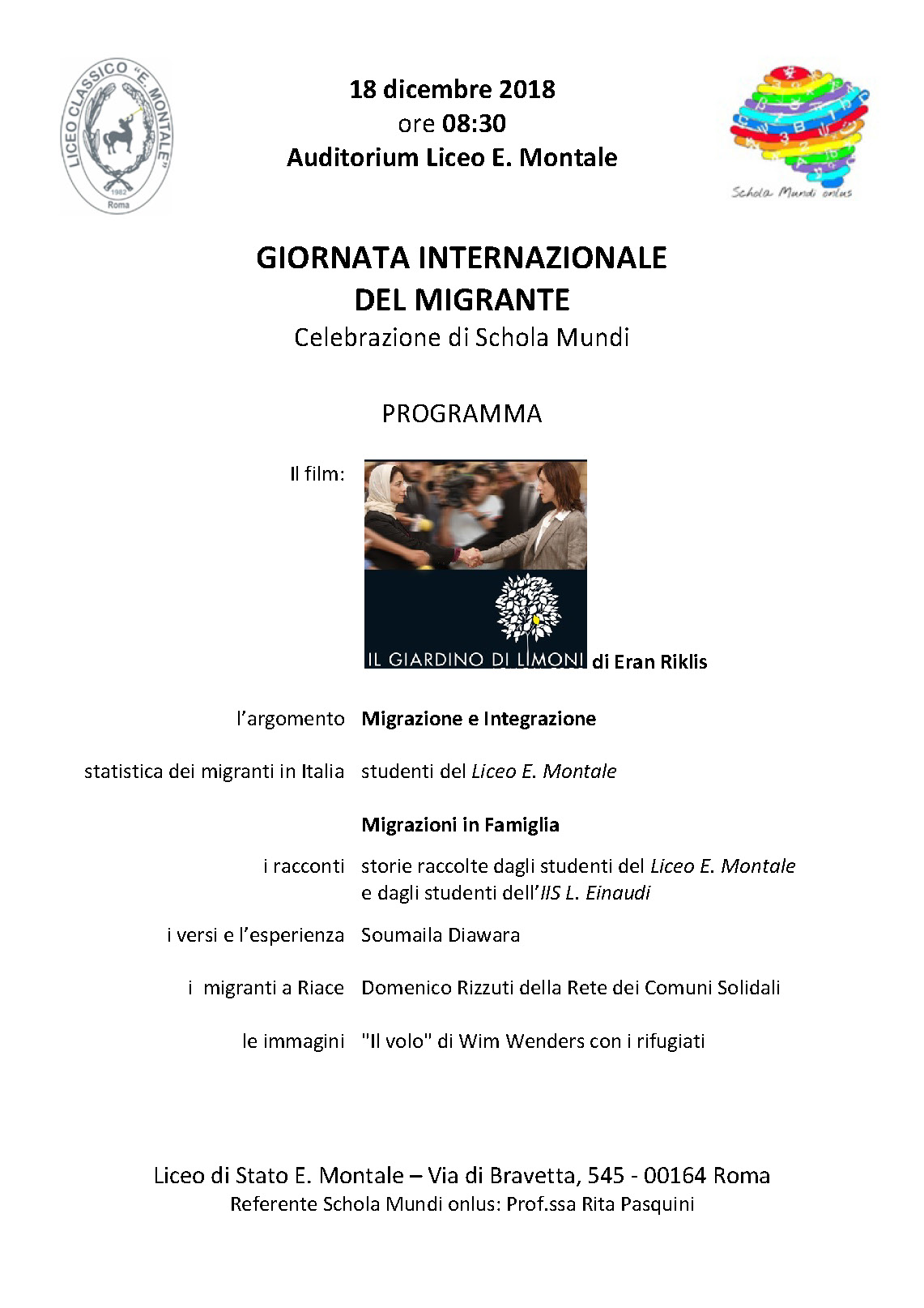 Martedì  18 dicembre, dalle ore 08:30 alle ore 13,00, nell’Auditorium del Liceo, ci sarà la celebrazione della Giornata del Migrante. Il programma comprenderà la visione del film Il giardino di limoni di Eran Riklis; il saluto di Schola Mundi; la lettura di alcuni dei racconti di ‘Migrazioni in Famiglia’ elaborati dagli alunni del Liceo e dagli ospiti del l’IIS Luigi Einaudi, alunni e Prof.ssa  Elvira Cerrito; la presentazione del ‘problema’ della migrazione in Italia di alcuni studenti del Liceo; le testimonianze di Soumaila Diawara, scrittore del Mali, e Domenico Rizzuti della Rete dei Comuni Solidali.