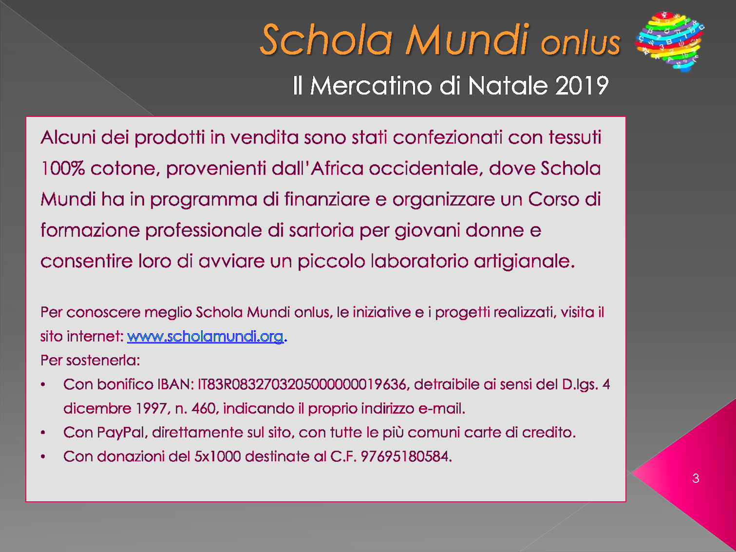 Sostienici: Schola Mundi Onlus - IBAN: IT83 R083 2703 2050 0000 0019 636 - 5x1000 al C.F. 97695180584