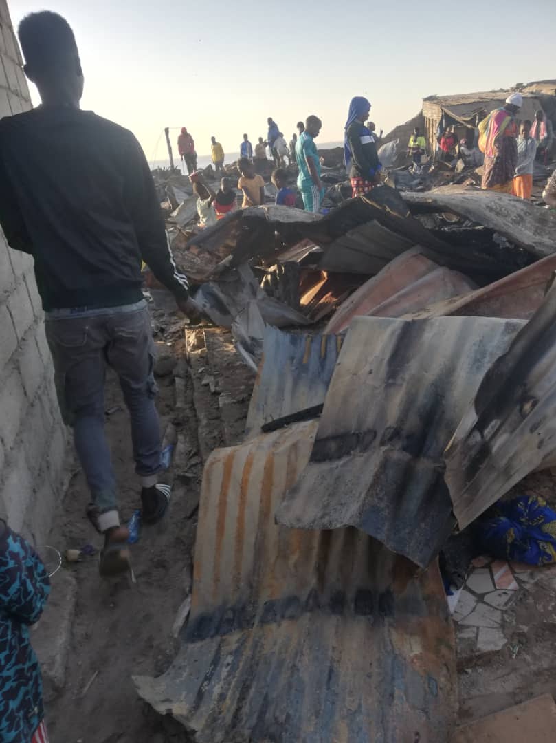 Il laboratorio-sartoria di Schola Mundi, rimasto in piedi, ha dato spazio ad alcuni bambinii. Youssouph Aw - Chef du Projet 'Coudre et Recoudre' a Yarakh - ricovera ibambini nell'Atelier di Schola Mundi durante l'incendio che questa notte ha devastato il quartiere dei pescatori a Dakar: