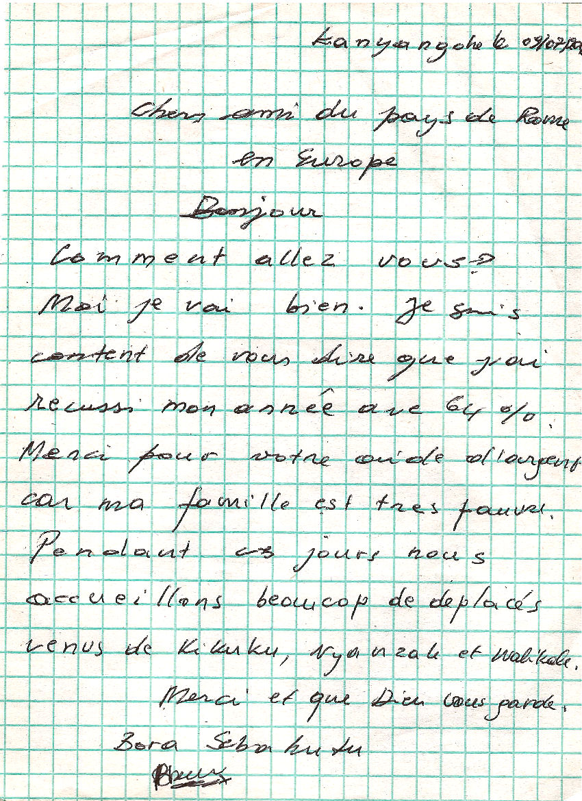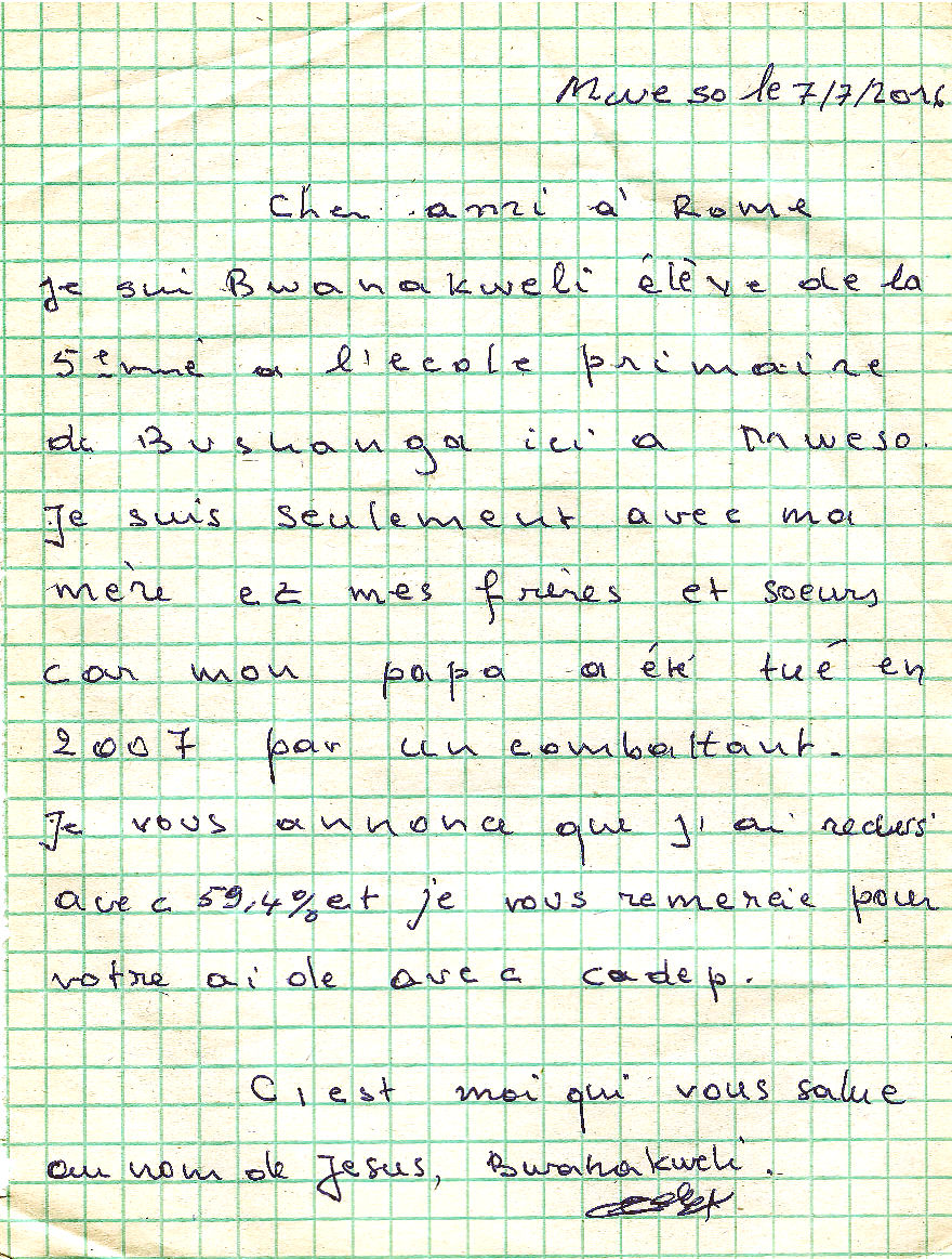 Io sono Bwanakweli alunna della 5^ nella scuola primaria di Bushanga qui a Mweso. Sono sola con mia madre  e i miei fratelli e sorelle perché mio padre è stato ucciso nel 2007 in combattimento.