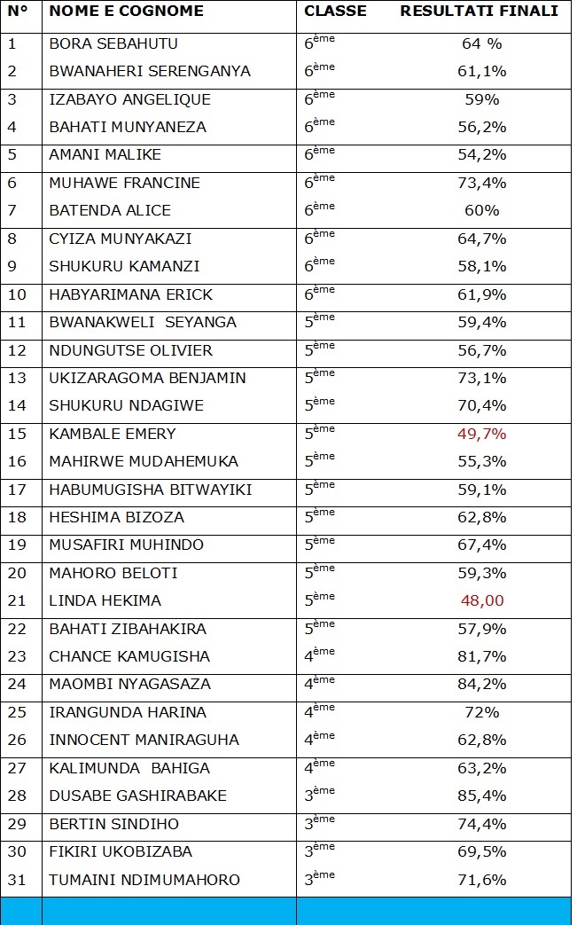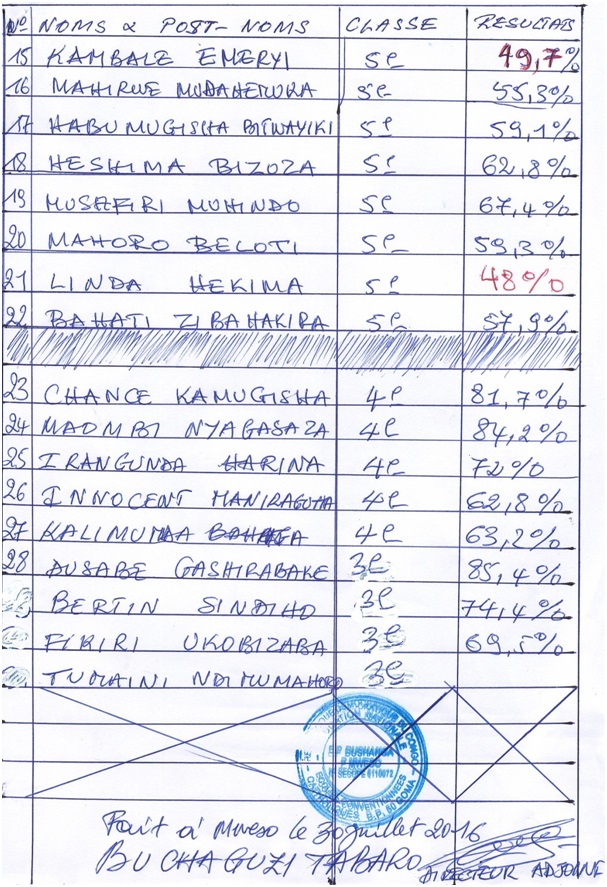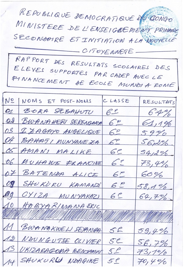 Nell’insieme, i risultati dell’anno sono molto buoni per tutte le bambine e i bambini beneficiari del progetto P2P da studente a studente 2015 di Schola Mundi. Su 31 studenti, di tutti i livelli, solo 2 studenti, ossia il 6,5% non ha raggiunto la sufficienza. Constatiamo con grande soddisfazione che 8 su 31, ovvero il 26% del totale degli studenti sostenuti ha ottenuto una menzione di distinzione, a dimostrazione di come questi giovanissimi sono determinati a vincere la sfida dell’educazione scolastica.