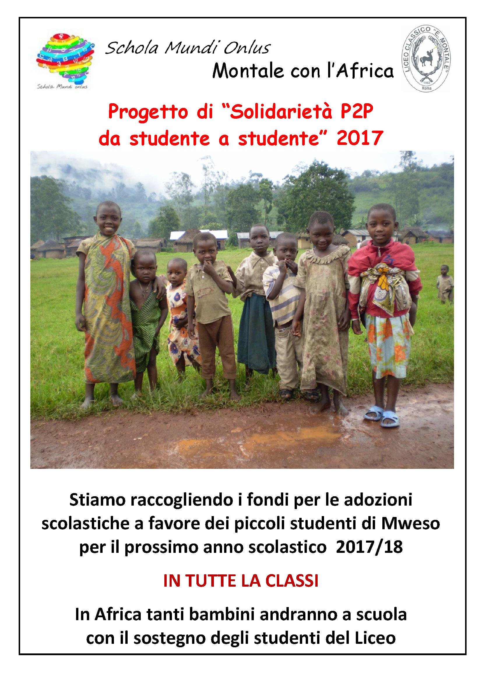 Grazie all’impegno e alla generosità degli studenti, degli insegnanti e del personale tutto del Liceo Eugenio Montale, anche quest’anno, la raccolta di Pasqua per il progetto "Solidarietà P2P - da studente a studente" permetterà di mantenere i nostri impegni di solidarietà verso i bambini della Scuola Primaria Bushanga di Mweso.