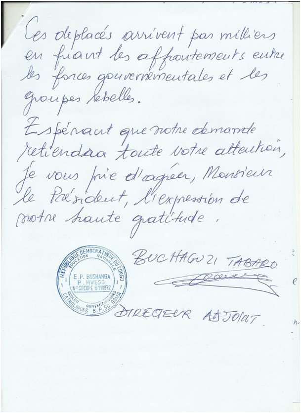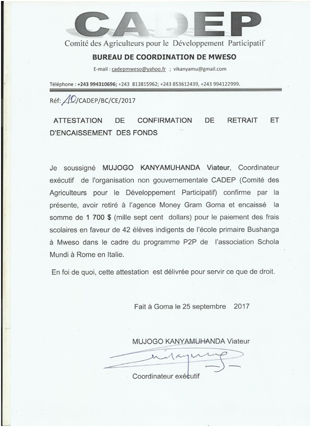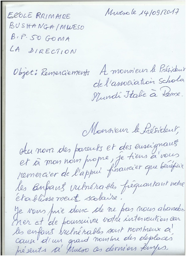 Ringraziamenti del Direttore della Scuola Primaria Bushanga di Mweso per il finanziamento di Schola Mundi onlus: