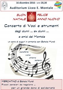 E’ ormai una tradizione il Concerto di Schola Mundi al Liceo E. Montale di Roma prima della interruzione didattica per le festività. E’ l’occasione per sostenere l’impegno dell’associazione per la formazione in Africa e l’educazione alla solidarietà e al volontariato nel Liceo. Ma è anche e soprattutto l’occasione per incontrarci, farci gli auguri e rivederci, tutti insieme, docenti, genitori, studenti, di oggi e di ieri, e amici del Montale, per  augurarci un Buon Natale e un più  Felice Anno Nuovo. Ascoltare le ragazze e i ragazzi, gli ex allievi e gli amici del liceo in una festa di voci e di sonorità, in armonia con Schola Mundi, in un Concerto di Auguri.