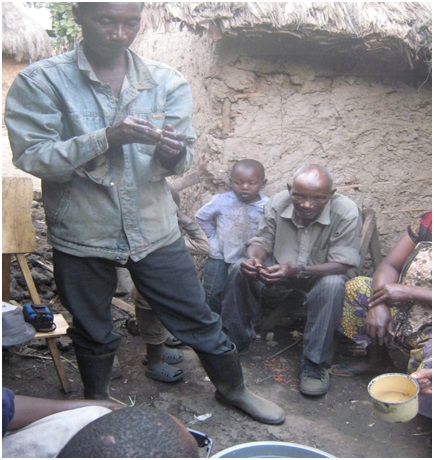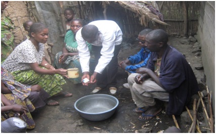 Immagine 1 : L’Educatore Roger dimostra la tecnica corretta di come si lavano le mani osservato attentamente dal gruppo Usafi nel piccolo villaggio di Muhongozi.